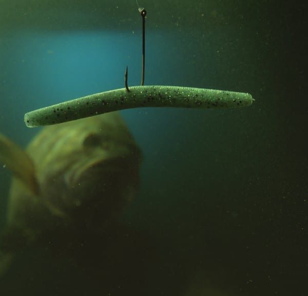Basically, it’s a thick-bodied, dense worm that slowly sinks on its own, without adding a sinker. All you do is insert a large hook through the hook body at the exact center of the worm. Then toss it out, and let it sink to the bottom.